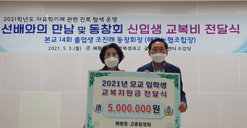 해평중학교(교장 이옥이)는 지난 3일, 본교 글로벌지원센터 소강당에서 해평중학교총동창회장으로부터 2021학년도 신입생 교복비를 전달 받았다.
